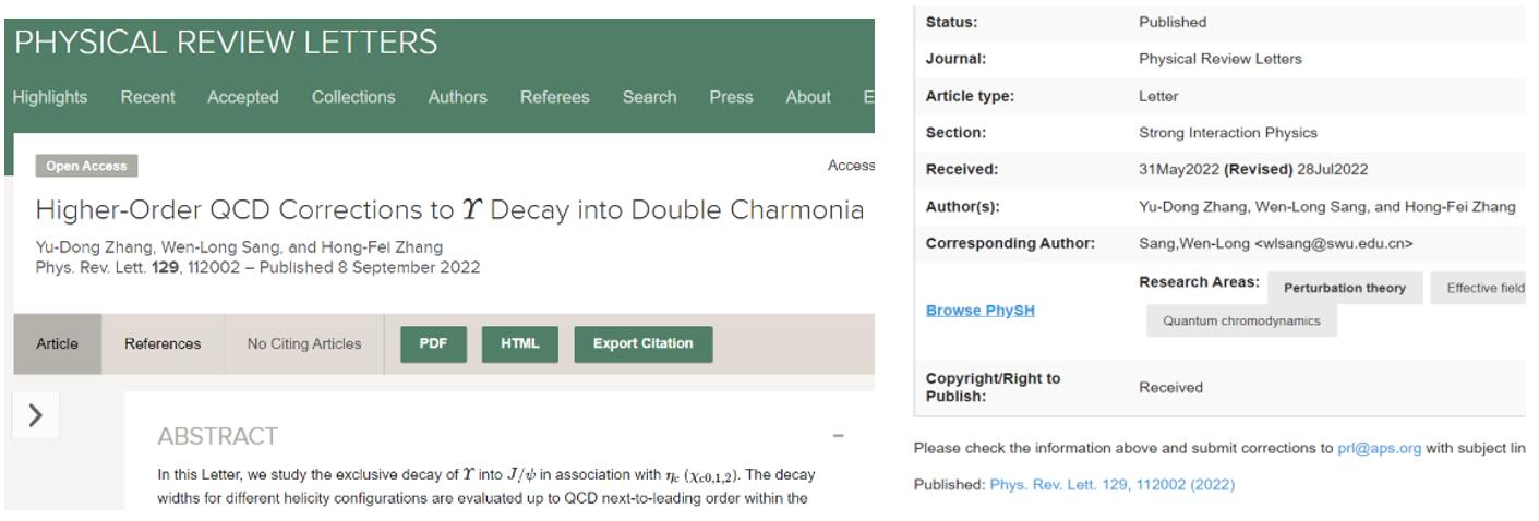 近日色情网址大全强子物理团队桑文龙教授与研究生张余栋同学及贵州财经大学的张鸿飞老师在物理学顶级期刊《物理评论快报》(PRL)上发表题为“Higher-order QCD corrections to Upsilon decay into double charmonia”的科研工作,西南大学为该成果的第一及唯一通讯作者完成单位,其中张余栋同学为第一作者,桑文龙老师为唯一通讯作者。该研究工作得到了国家自然科学基金面上基金资助。